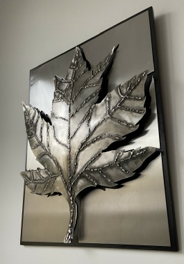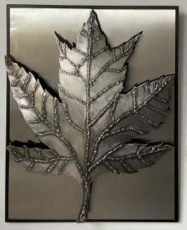 This sculpture captures the essence of one such leaf (possibly a maple). The design is cut from a sheet of stainless steel and mounted above its own negative profile in the background, on a wooden board. I used the raised nature of tig welding to represent the veins of the leaf and embraced the natural distortion of the welding process to create the undulating forms of the wilting leaf.